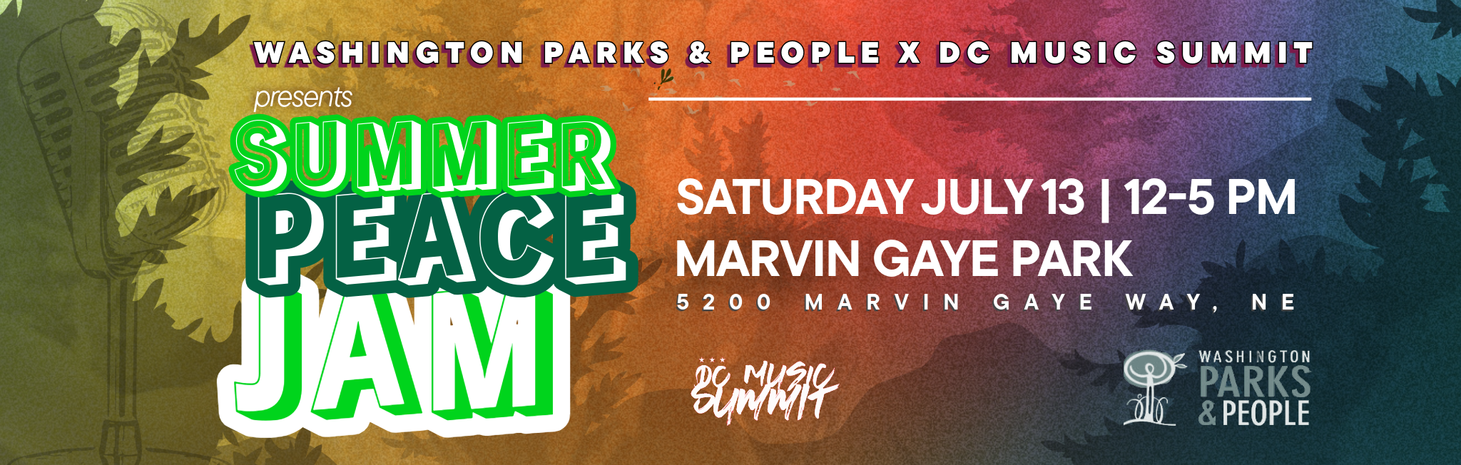 Join us for an inspiring and transformative event as Parks & People partners with the award-winning DC Music Summit to host the Summer Peace Jam on July 13, 2024, from 12 pm - 5 pm at Marvin Gaye Park in Washington, D.C. This event is designed to promote peace in the Ward 7 community and help bridge the health gap for its residents.