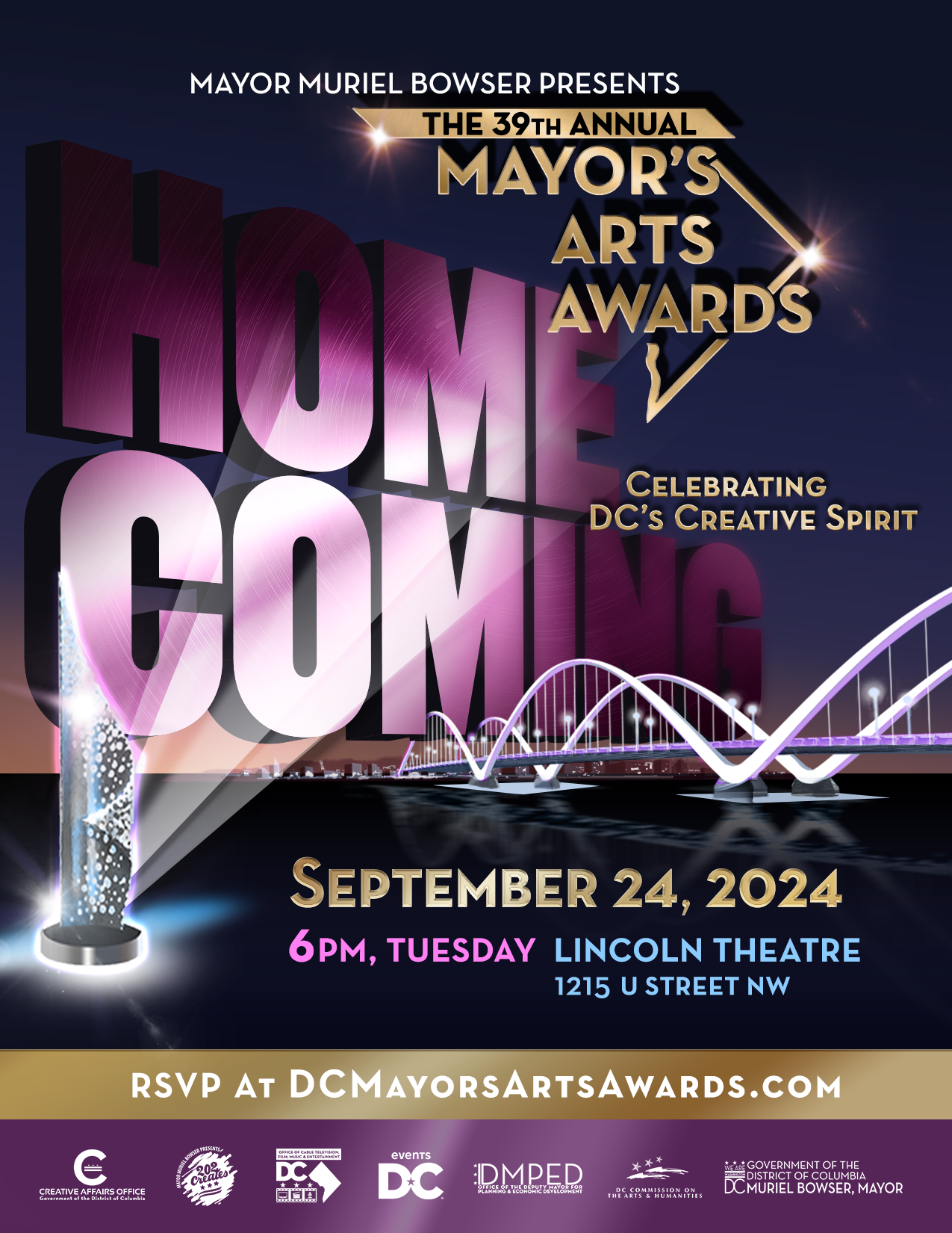 The Mayor’s Arts Awards is an inclusive celebration for District residents of all 8 Wards, honoring the city’s vibrant creative community and patrons of the arts and humanities. The night will feature unforgettable performances, acknowledgments, and awards presentations in 15 diverse categories.